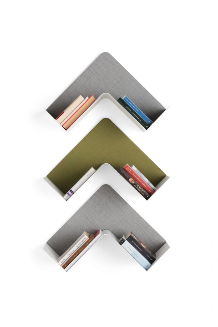 Fishbone moves in the range of 45 and 90 degrees, in pairs or in multiple-piece combinations, decorating the walls with functionality; the fabric-covered version also has soundproof properties.