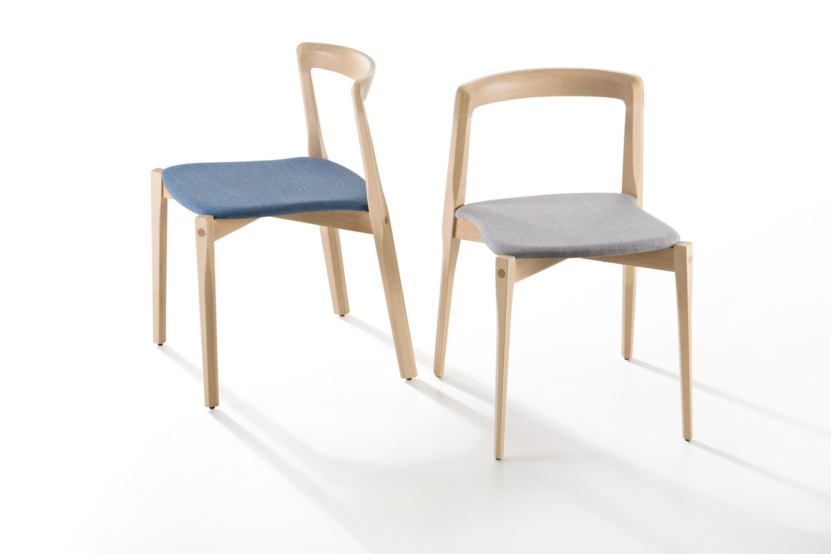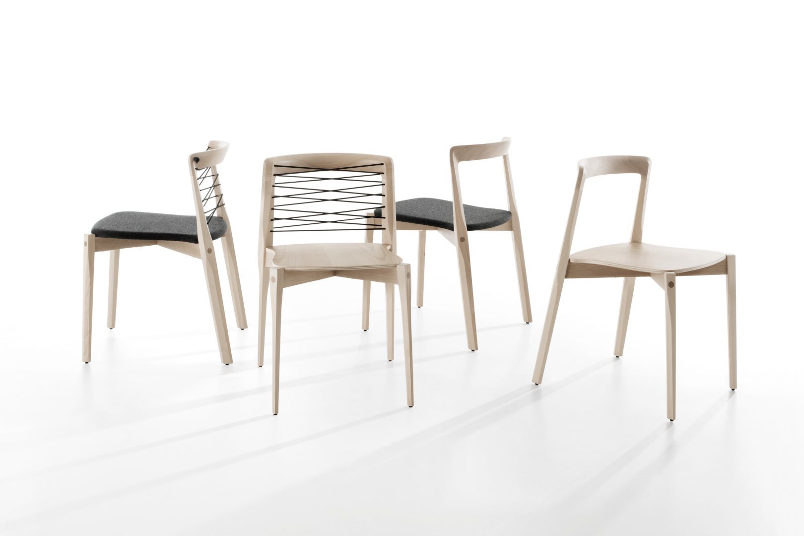 La seduta sottile è in multistrato di legno, a vista o rivestita in tessuto. Lo schienale è disponibile sia nudo sia nella versione con “corsetto” di corda elasticizzata.