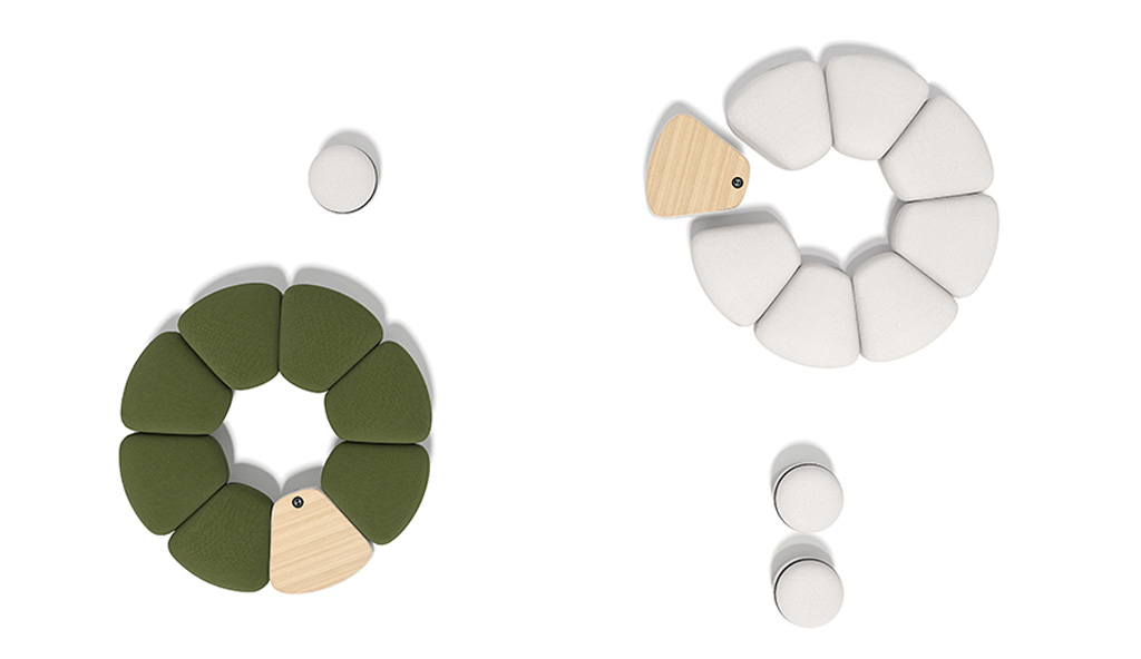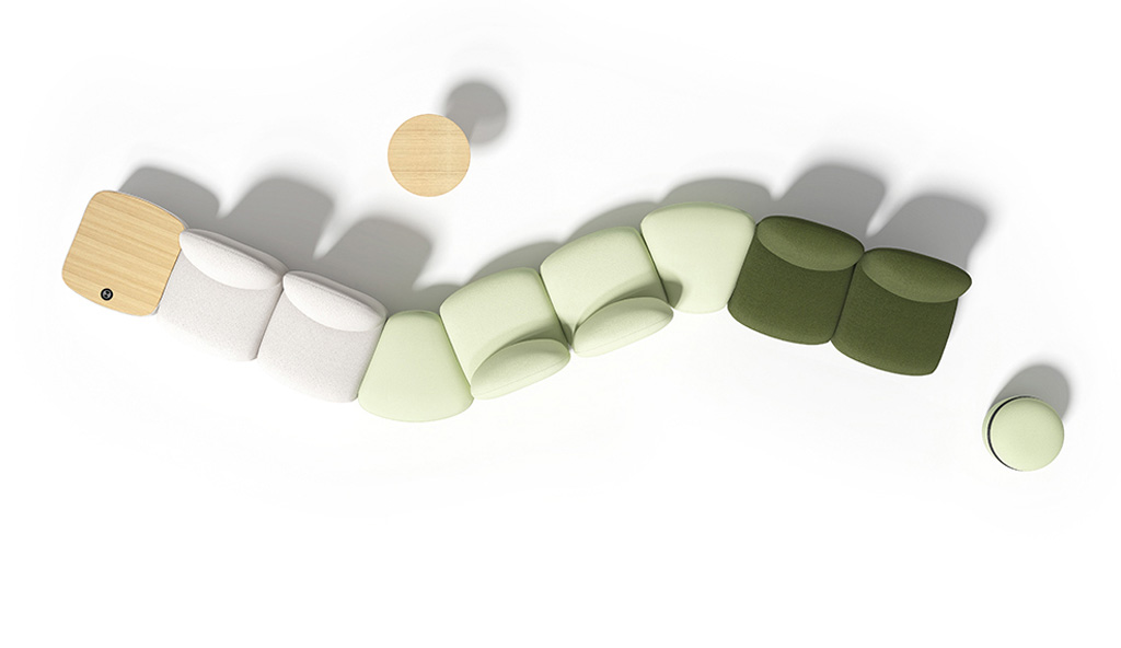 Le sedute modulari sono composte da elementi angolari, tavoli e braccioli e molti accessori; i sedili sono stampati con schiuma ad iniezione e possono essere con tre diverse altezze dello schienale.