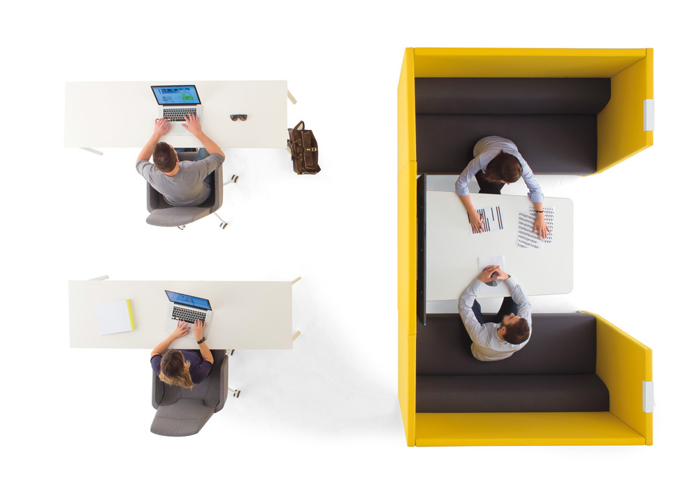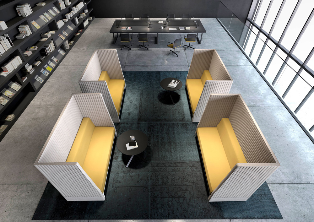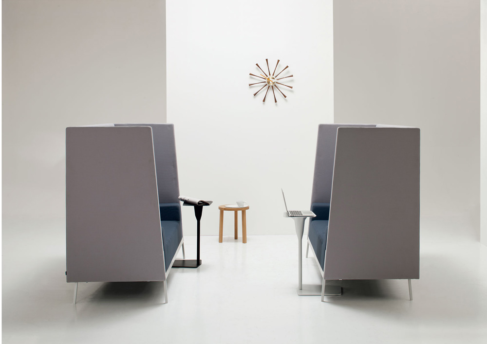 É parte della struttura in vista che caratterizza l'estetica di questo piacevole e classico divano a due posti. Estetica e funzione che con l'aggiunta dei pannelli laterali e di schiena cambia completamente. Da tradizionale divano per attese e contract diventa un posto protetto dai pannelli insonorizzati e rivestiti in tessuto coordinato, per un lavoro più appartato e per una più personale privacy. Ne completa la seria una poltroncina su quattro gambe con ruote, per tavoli meeting, fronte scrivania o attese.
