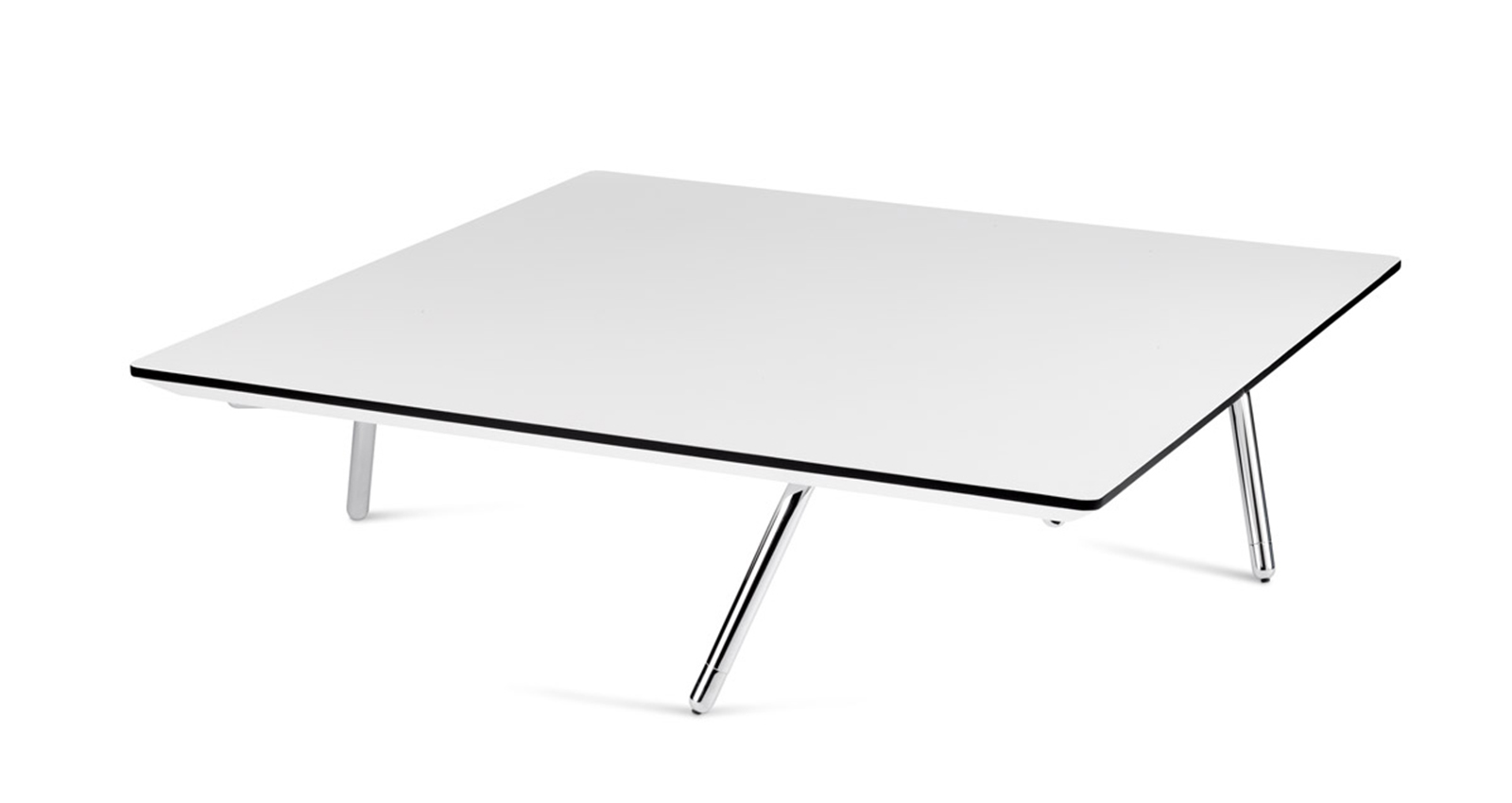 The stratified base in mdf is holded by four legs made of chrome/dyed tube. Thanks to a special alluminium melting articulation and to the special legs’ shape, it is possible to change their height only through a rotation of the. This mechanism allows the transformation of a dining table into a low living room table.