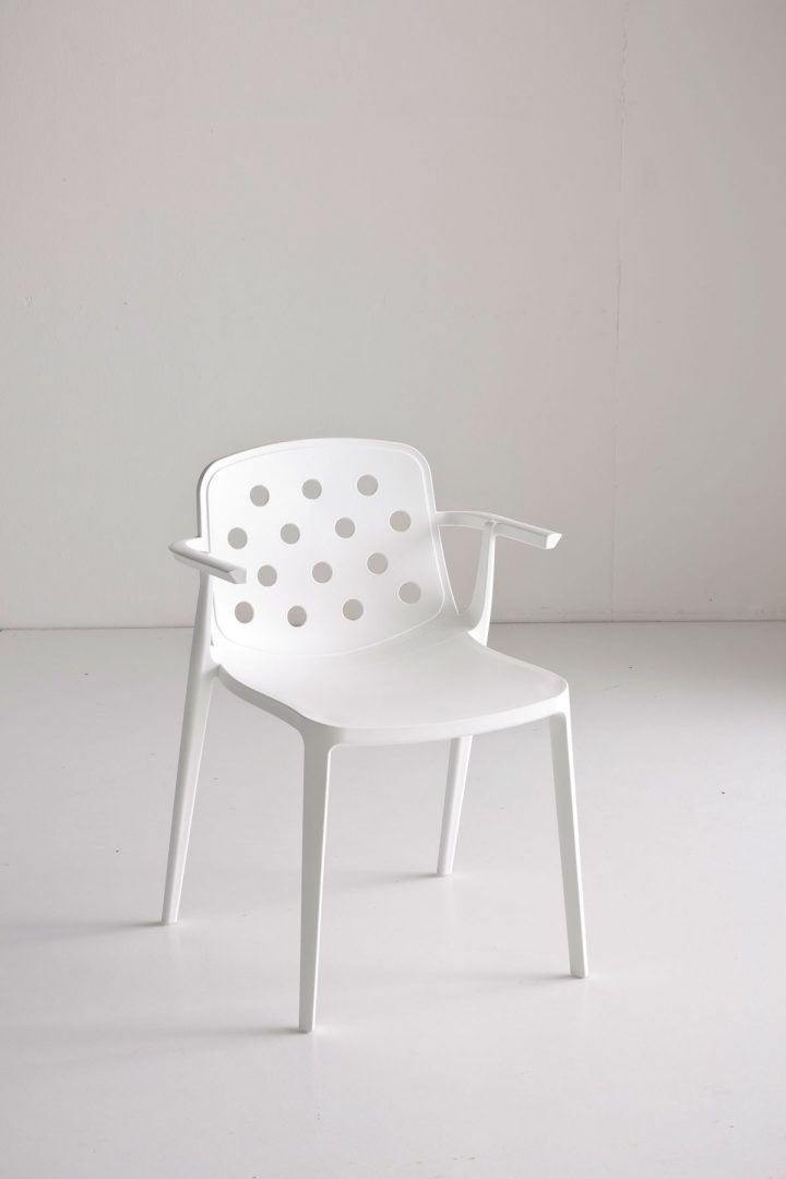 This seating collection is composed of single-piece chairs, with and without arms, as well as a stool version. It is also available with upholstered seats and seatbacks. The Isidoro family has a strong recognition and formal identity, mainly due to the functional stylistic details of the back legs. Especially for the stool, they become a practical hook for bags, jackets, caps and other items. Both the chairs and the stools are also