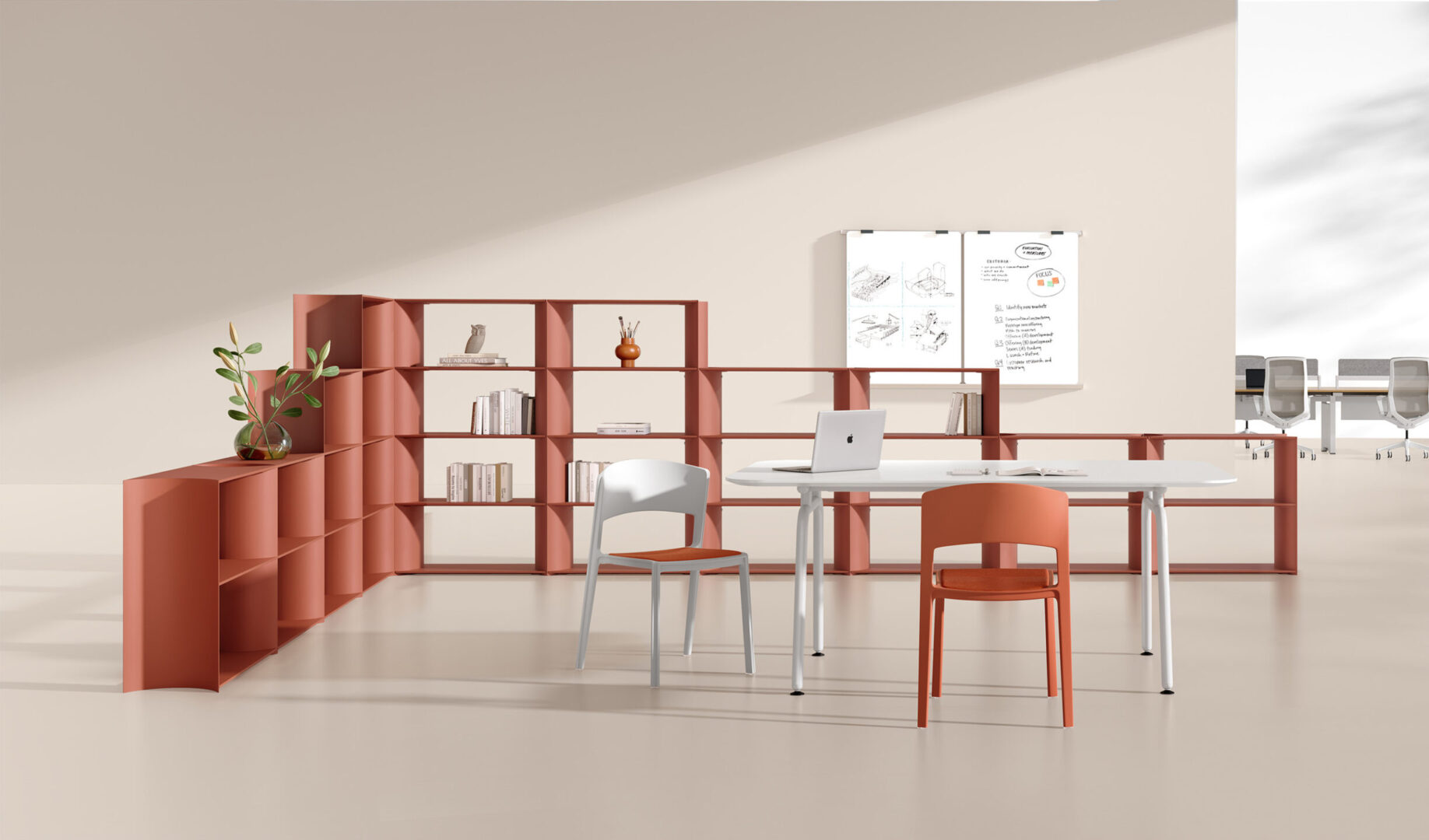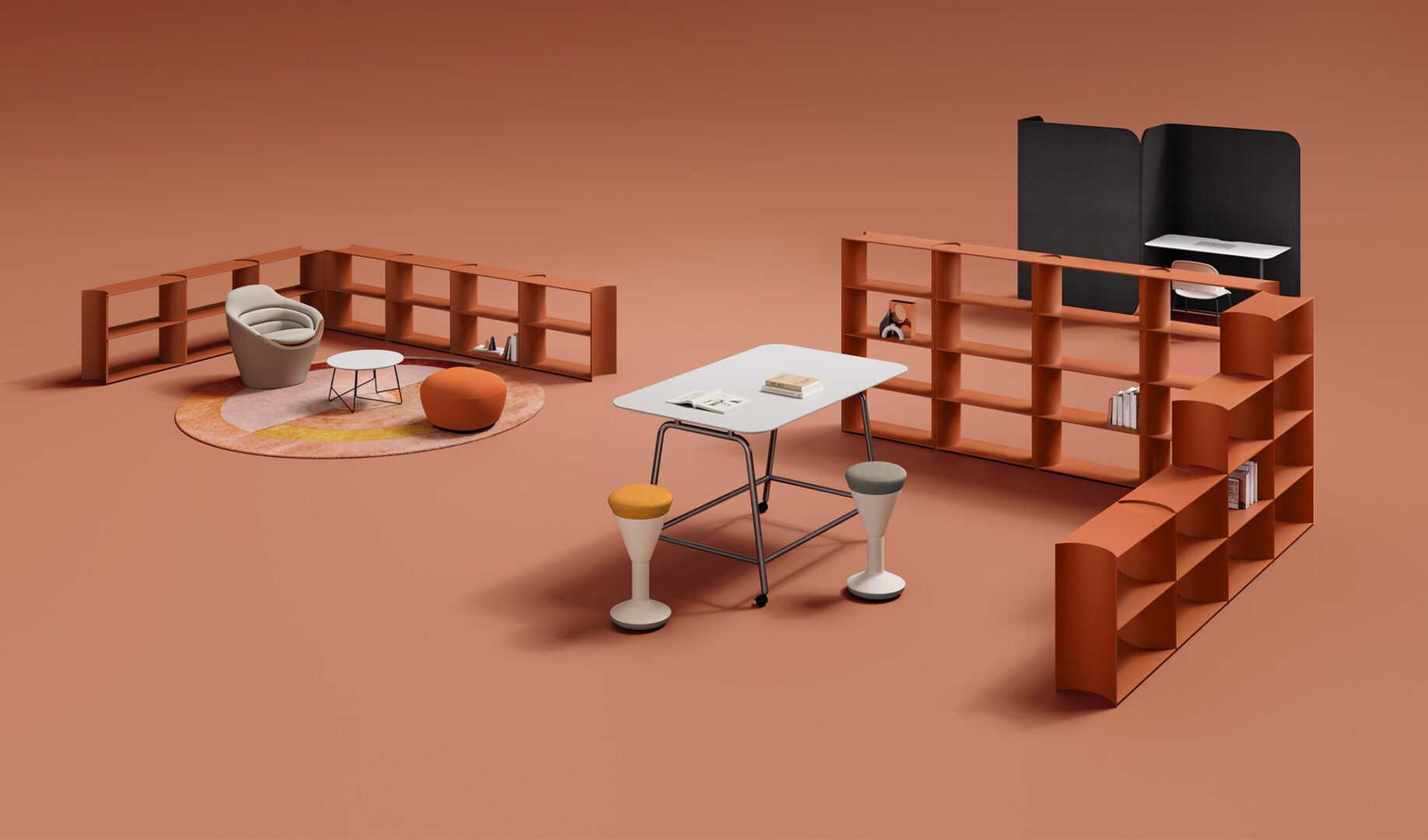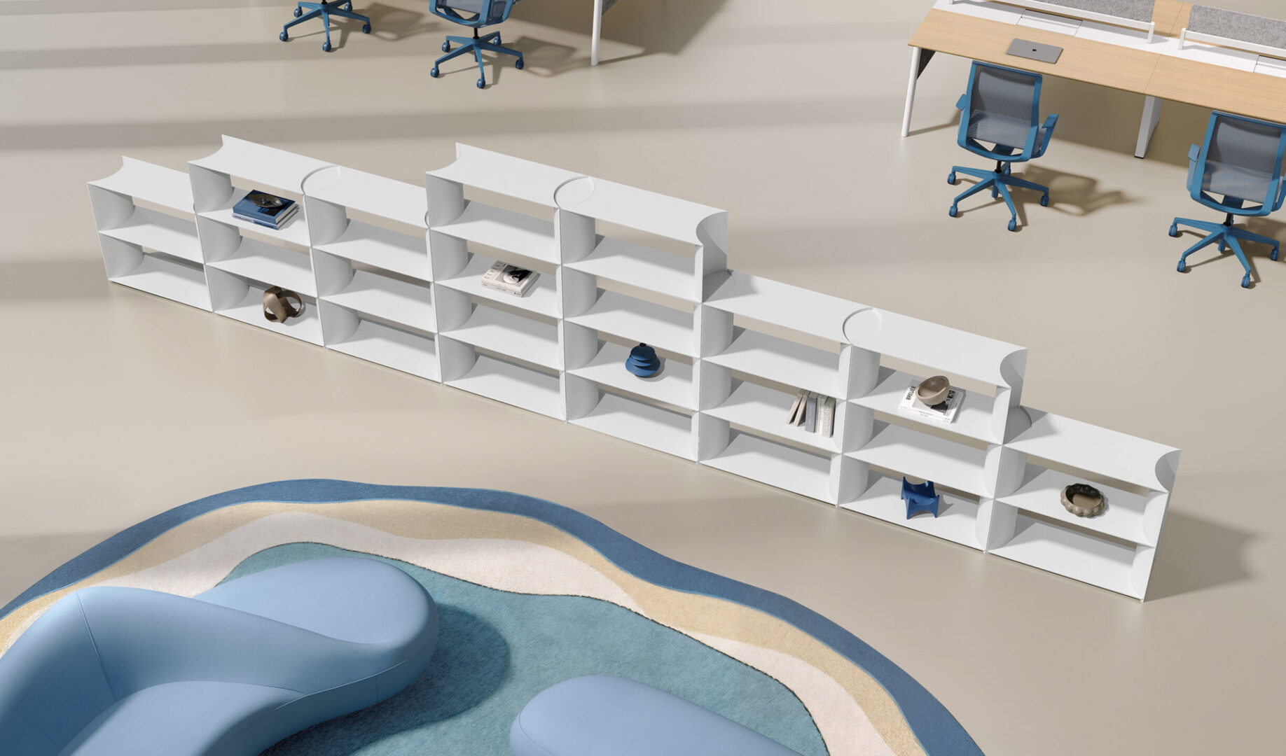 MixBlock is a modular shelving system designed for modern office environments. Its soft, rounded internal dividers create a distinctive visual rhythm while improving usability and safety in everyday use.