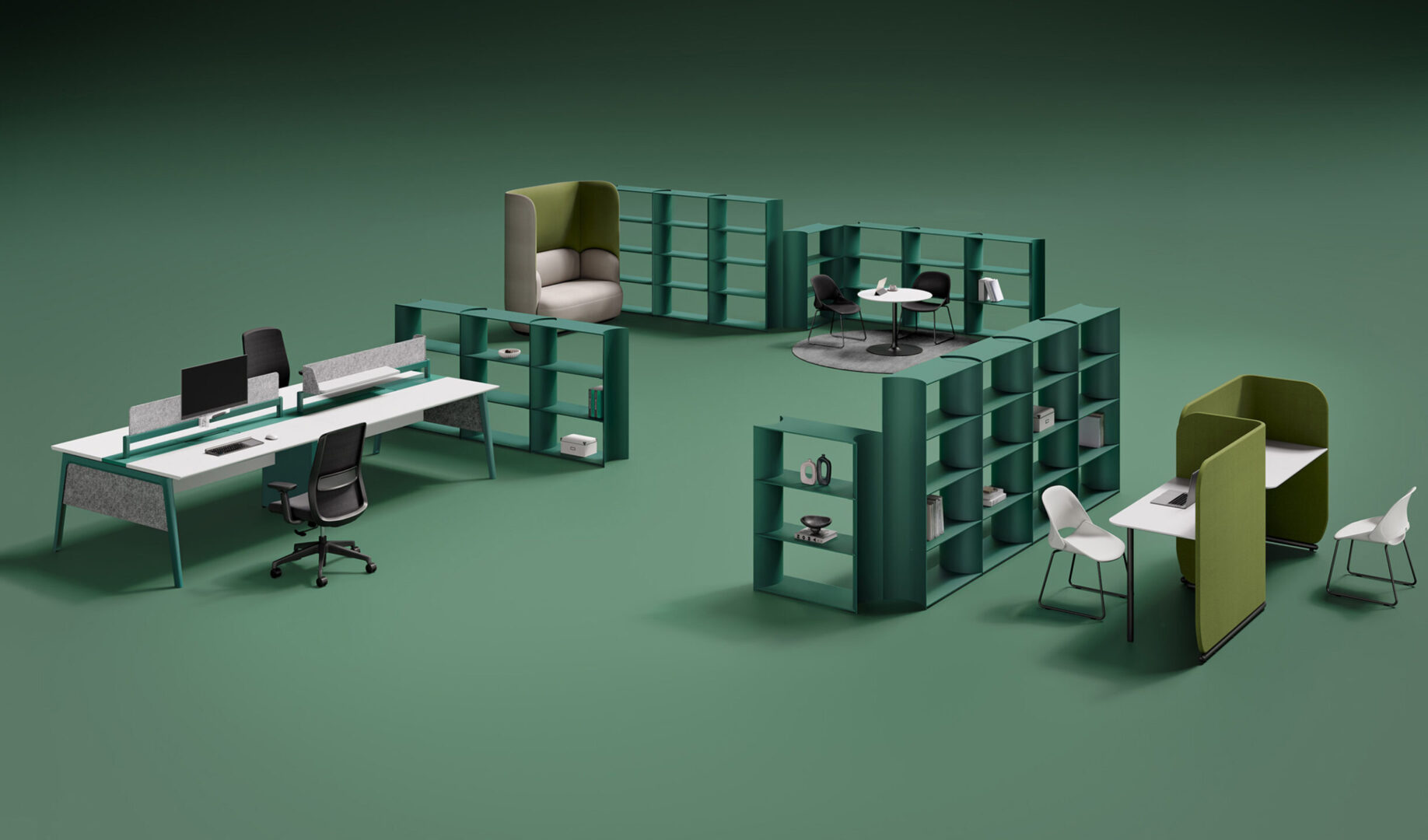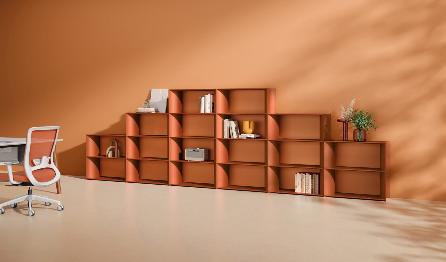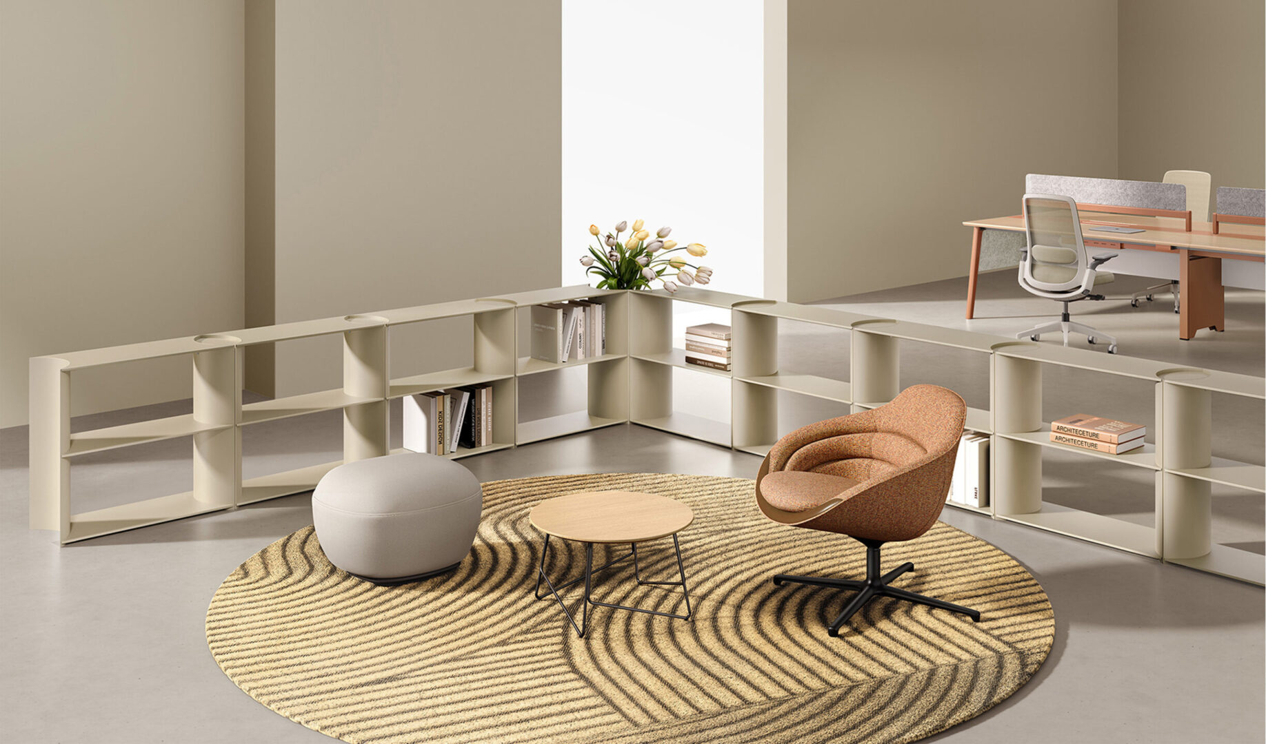 MixBlock is a modular shelving system designed for modern office environments. Its soft, rounded internal dividers create a distinctive visual rhythm while improving usability and safety in everyday use.