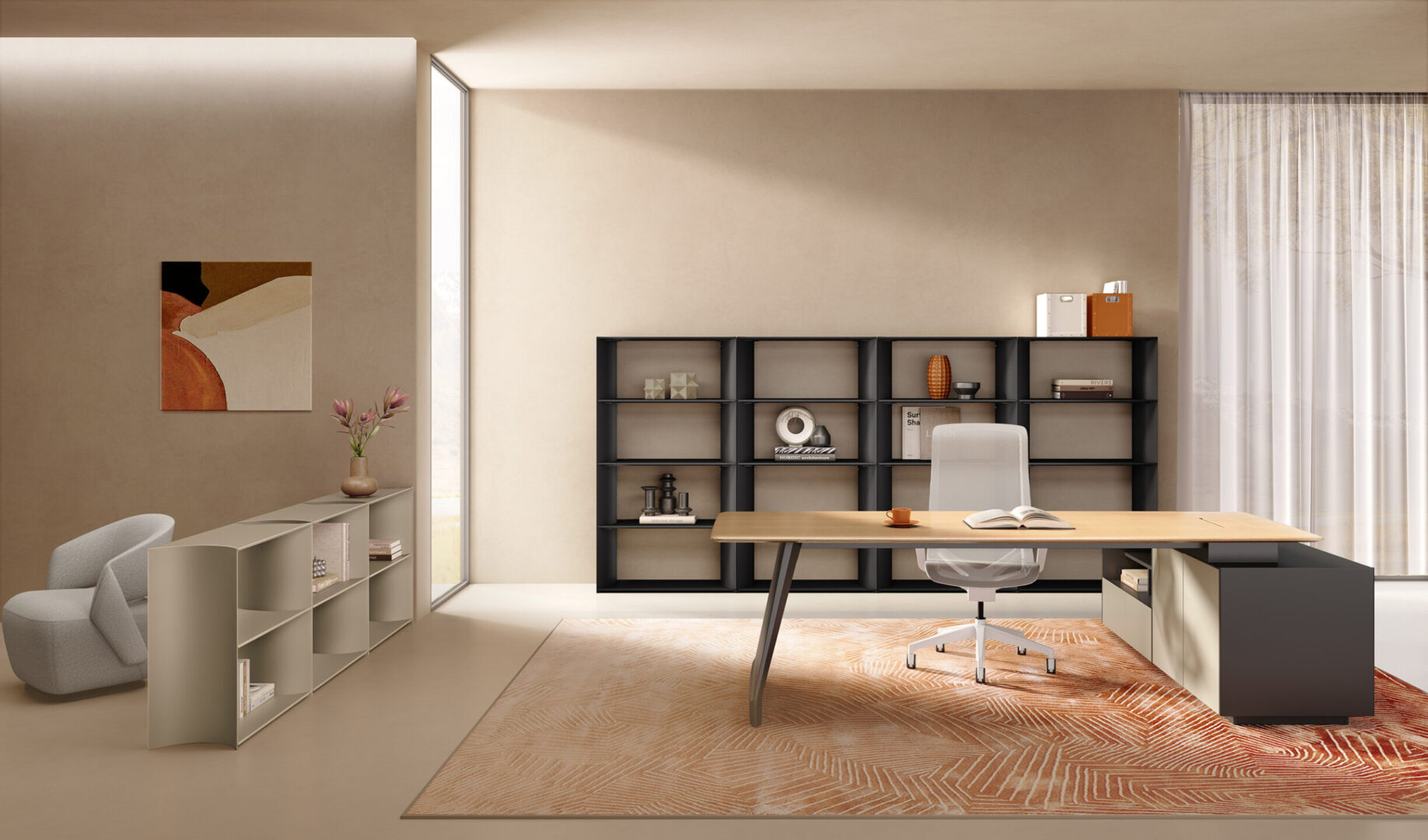 The stepped configuration adds flexibility, allowing the unit to function as both storage and a subtle space divider. It helps organize books, objects, and office essentials while maintaining an open and tidy atmosphere.