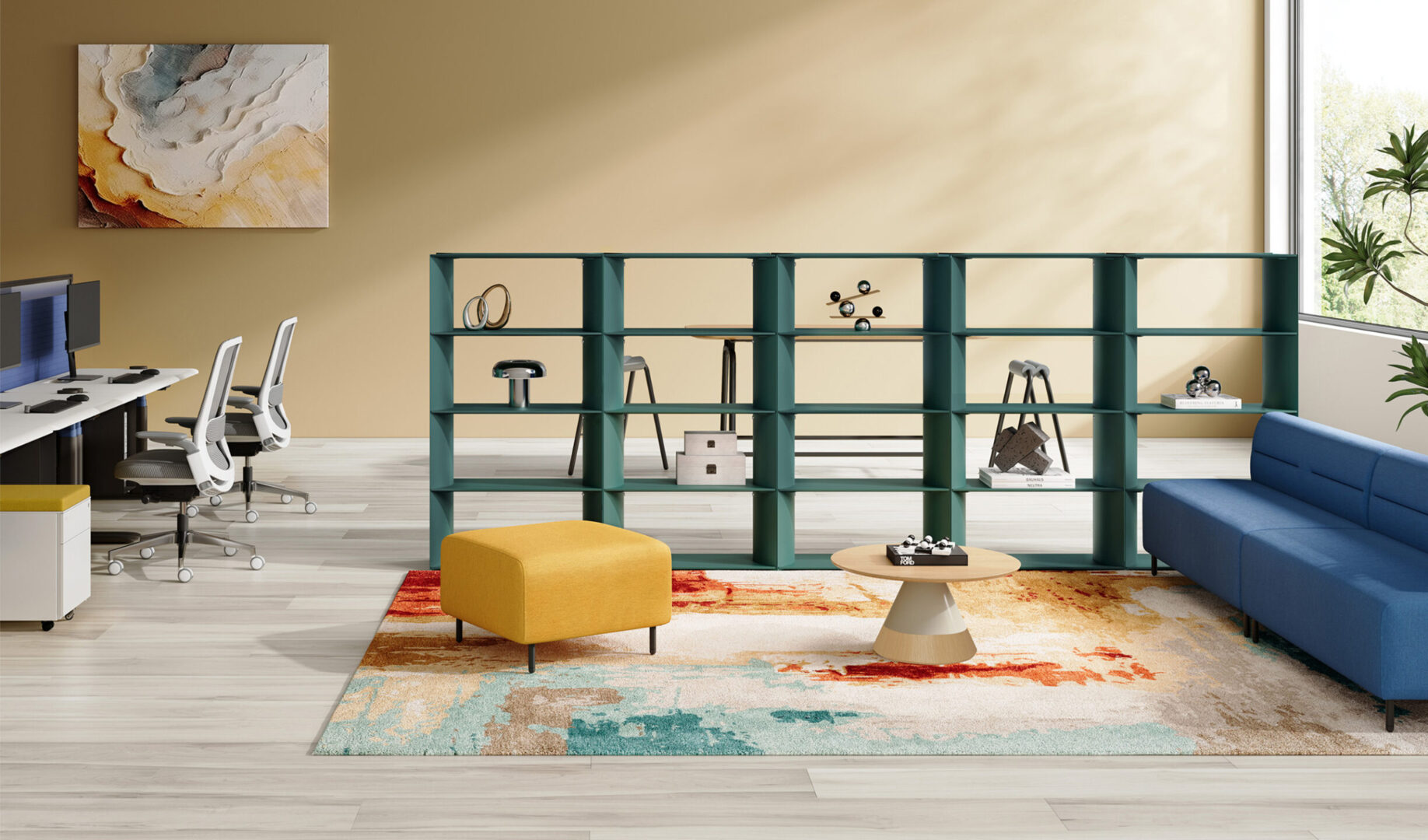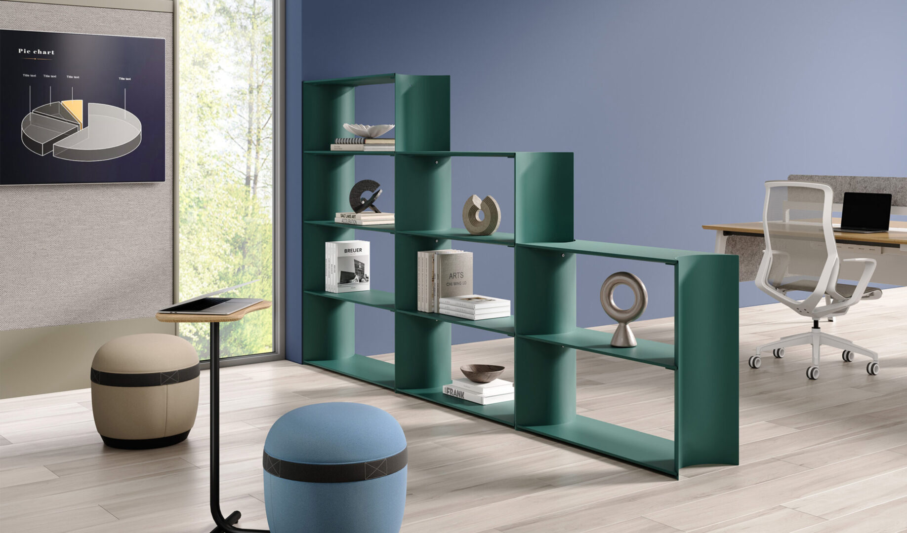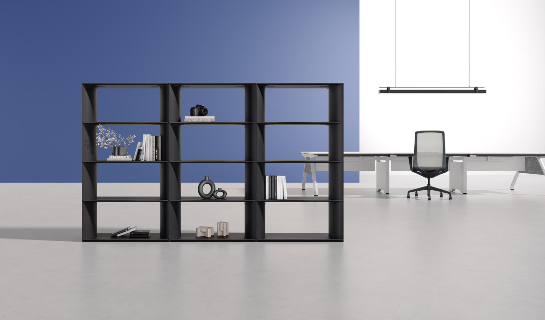The system supports different layouts, including linear and L-shaped arrangements, making it suitable for open offices, shared workspaces, or transitional areas. It creates separation between zones without fully closing off the space, supporting both focus and collaboration.
