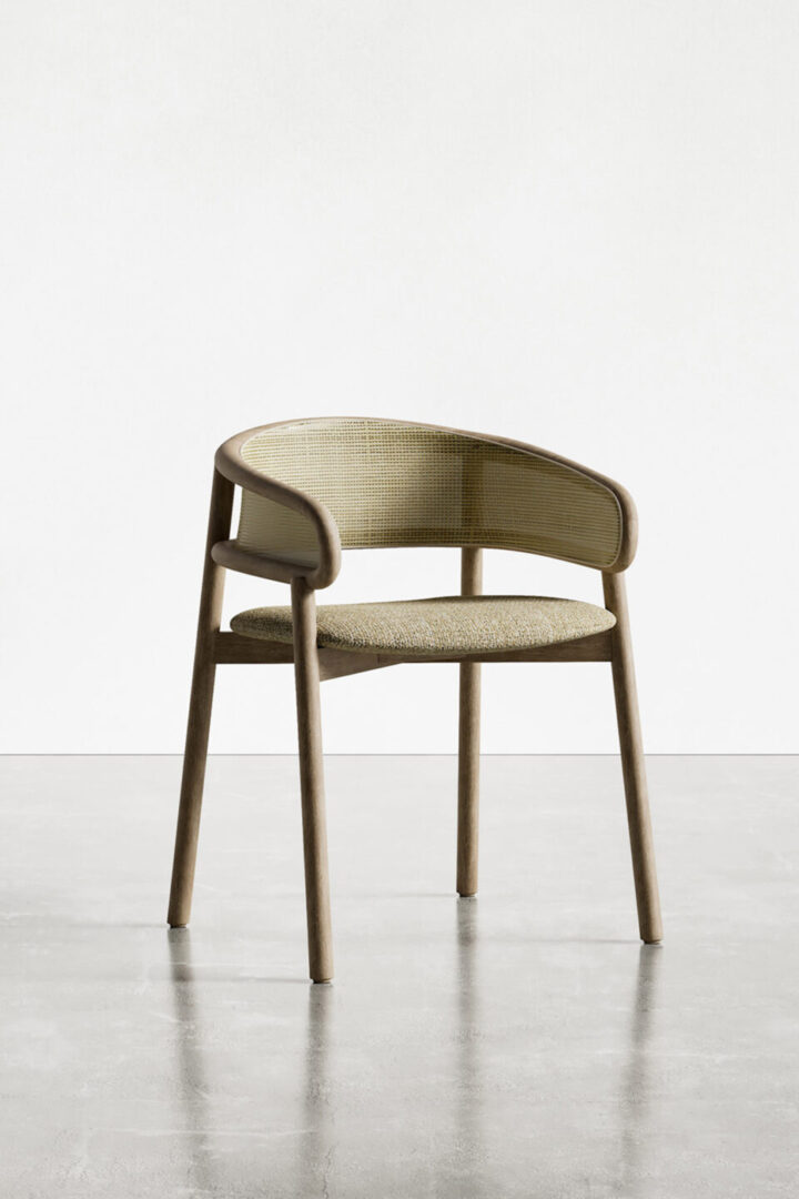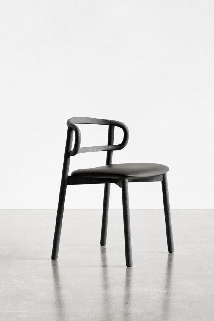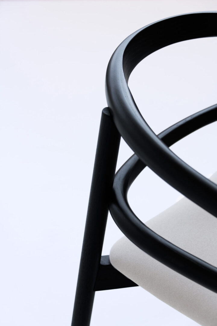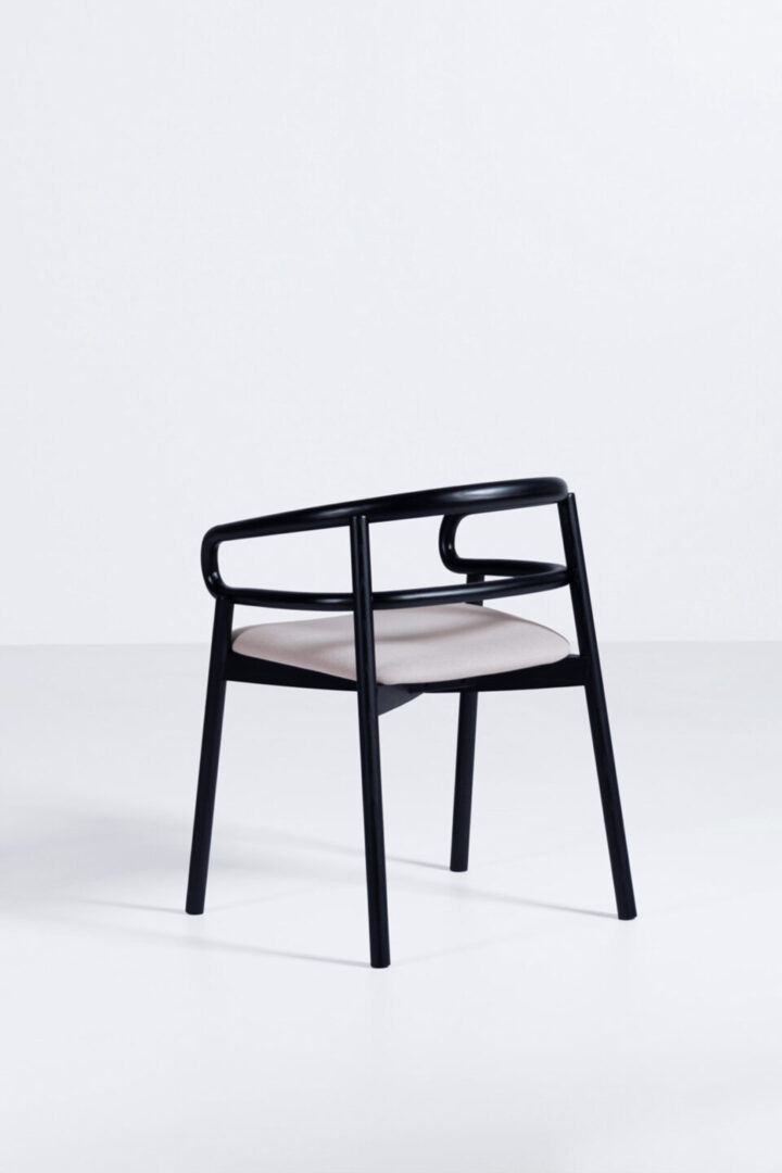 The defining feature of the Stadium dining armchair is its backrest, conceived in seamless continuity with the armrests as a single structural gesture. A wide, enveloping curve shapes an elongated elliptical form, evoking the motion of an embrace. The calibrated interplay of curved and straight lines creates a dynamic equilibrium in which geometric rigor and formal fluidity coexist naturally.