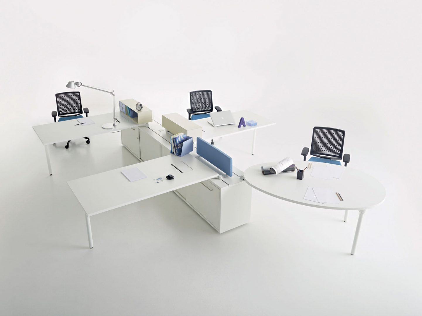 书桌系列。压铸铝和钢筒结构,层压板,木材和玻璃桌面。